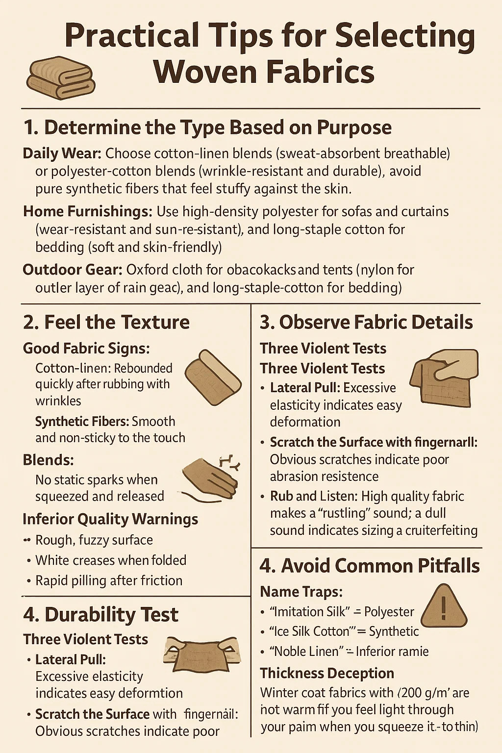 • Strofina e ascolta: il tessuto di alta qualità emette un suono "frusciante"; un suono sordo indica dimensionamento e contraffazione.