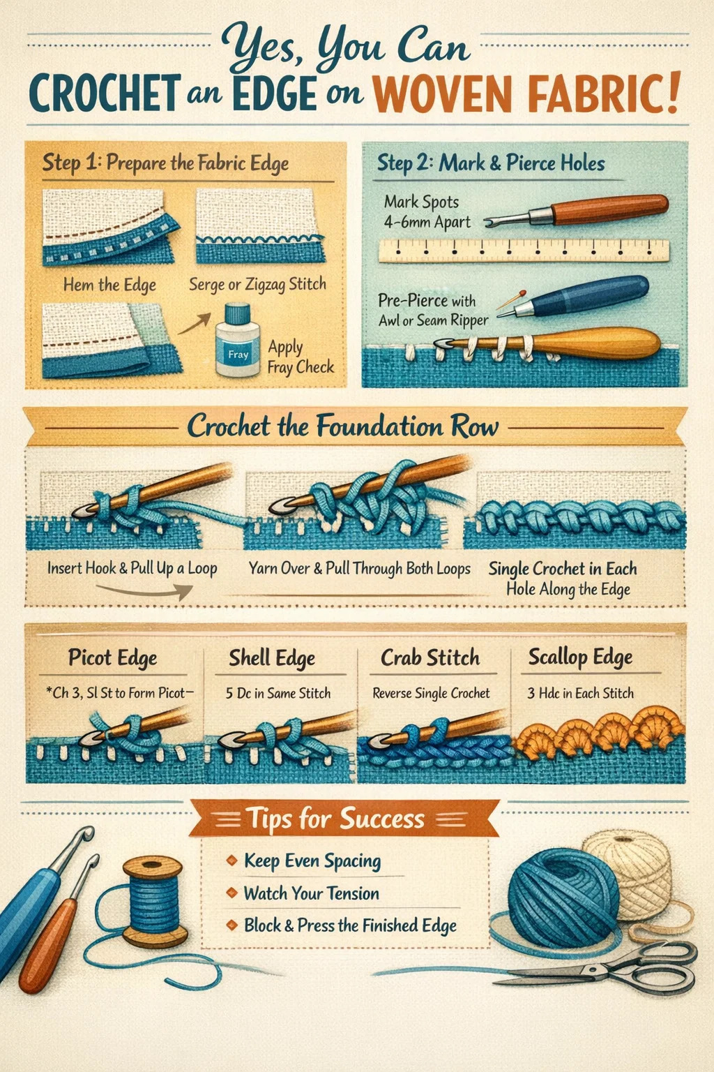 A differenza del tessuto a maglia, il tessuto intrecciato non ha anelli naturali in cui inserire l'uncinetto. Invece, fori il tessuto stesso o lavori attraverso fori già predisposti, ecco perché la tecnica e la preparazione fanno la differenza. Una volta compresa la meccanica, aggiungere un bordo all'uncinetto al tessuto, che sia cotone, lino, denim o qualsiasi altro tessuto, diventa un'abilità ripetibile e soddisfacente.