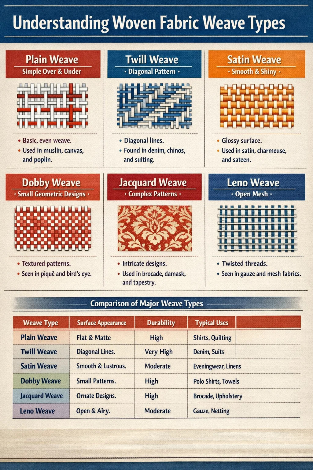 Quando si seleziona un tessuto, il tipo di trama deve corrispondere alle esigenze funzionali ed estetiche dell'uso finale. Considera le seguenti indicazioni pratiche: