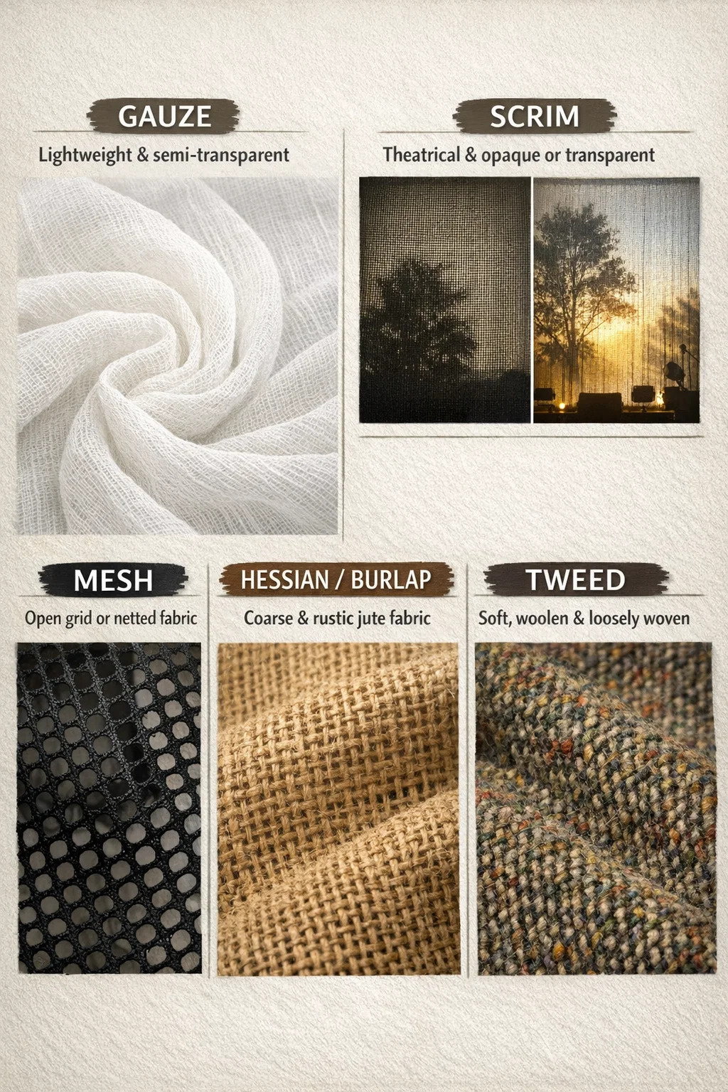Quando si parla di tessuti intrecciati con una "struttura sciolta e ampi spazi vuoti", esistono diversi termini molto specifici per descriverli, a seconda del loro utilizzo e aspetto.