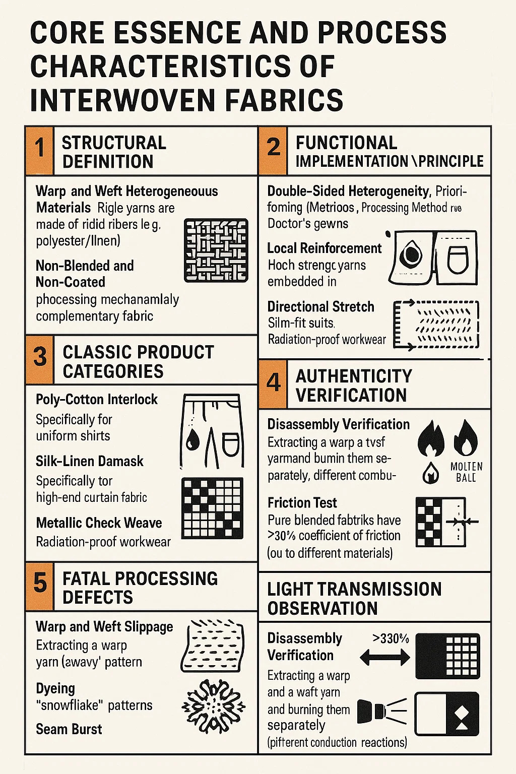 Materiali eterogenei di ordito e trama: i fili di ordito sono costituiti da fibre rigide (ad esempio poliestere/lino), mentre i fili di trama sono costituiti da fibre flessibili (ad esempio cotone/viscosa), creando un tessuto meccanicamente complementare.