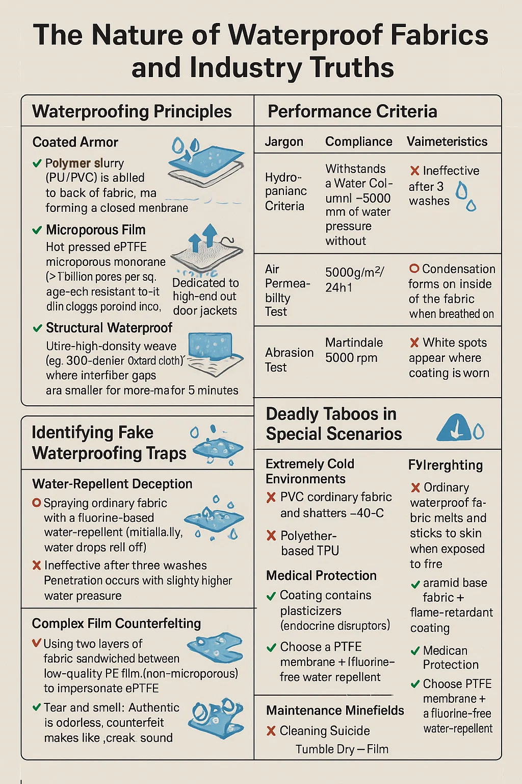 Impermeabile strutturale: tessuto ad altissima densità (ad esempio, tessuto Oxford da 300 denari), dove gli spazi tra le fibre sono inferiori alla pressione delle molecole d'acqua. ** Durevole ** Non può resistere a un temporale per più di 5 minuti.