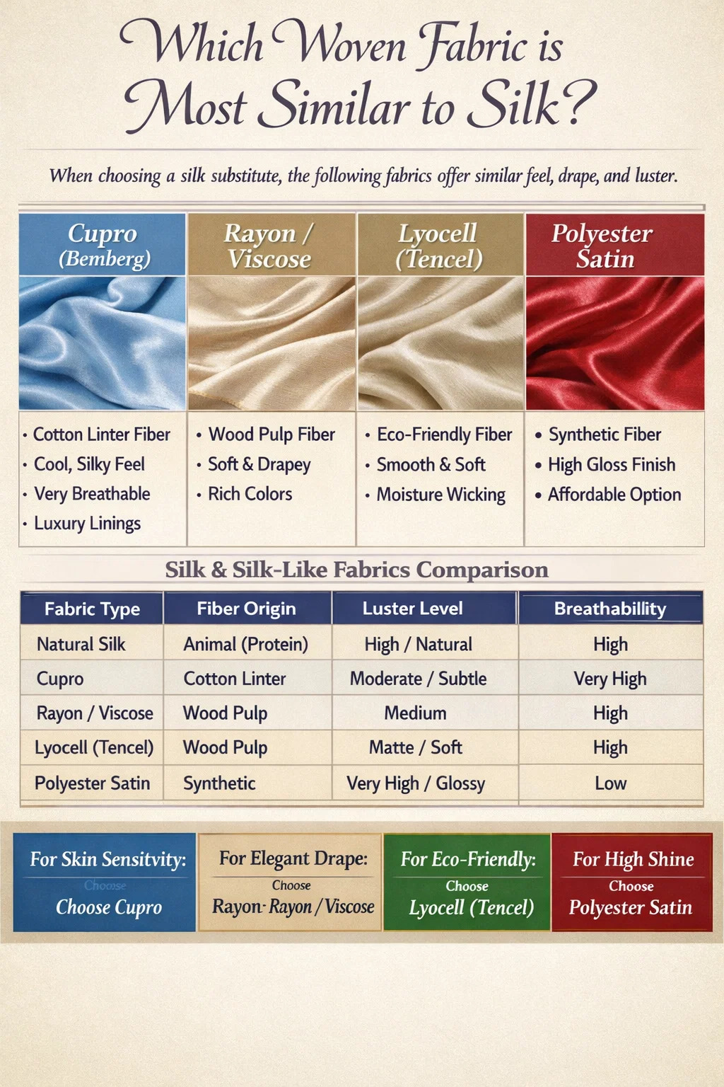 Durante la ricerca di a tessuto intrecciato che replica la sensazione lussuosa, la lucentezza e il drappeggio della seta naturale, sono i contendenti più importanti Rayon, Cupro e Lyocell (Tencel) . Tra questi, Cupro è ampiamente considerato la corrispondenza più vicina in termini di traspirabilità e tocco setoso, mentre Poliestere con trama satinata funge da alternativa sintetica economica più comune. Questi tessuti utilizzano specifici tessitura tecniche per imitare le fibre proteiche lisce prodotte dai bachi da seta.